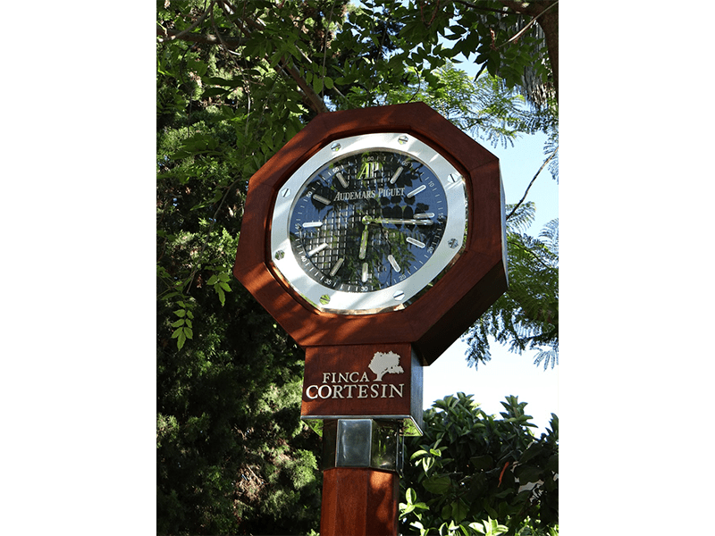 Reloj encastrado en soporte de madera de iroco con logotipo