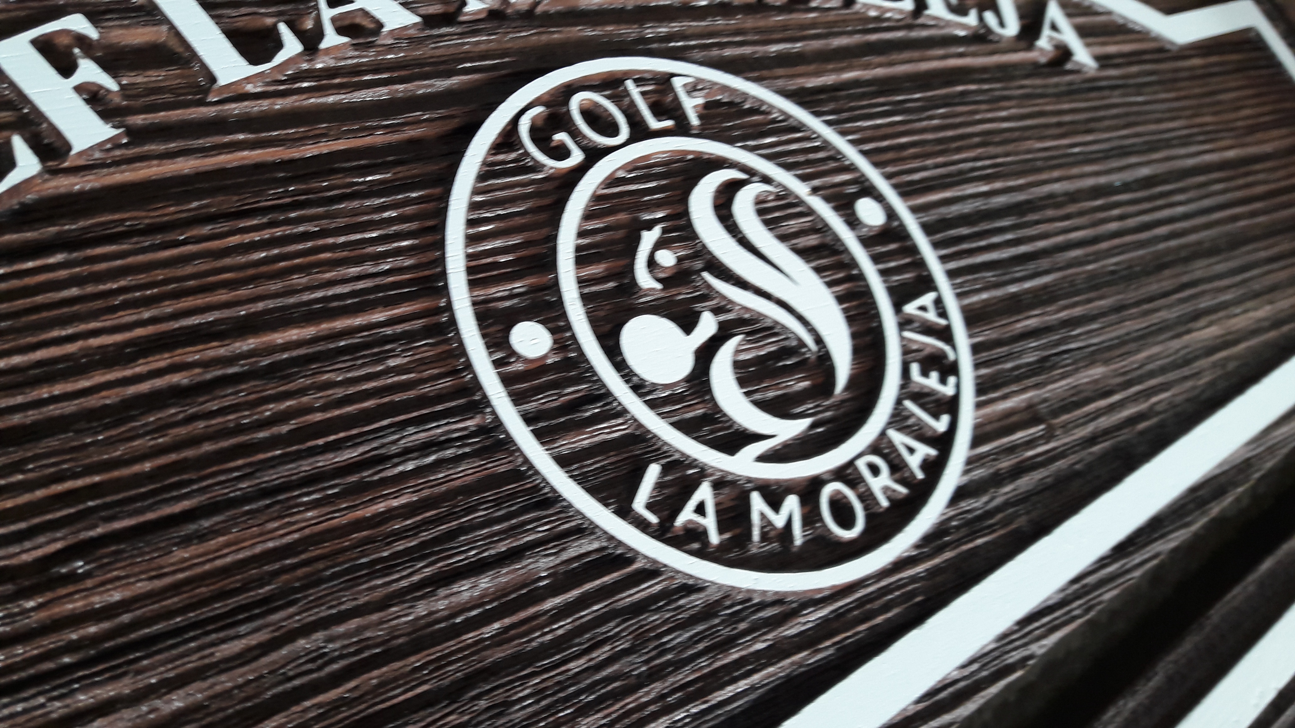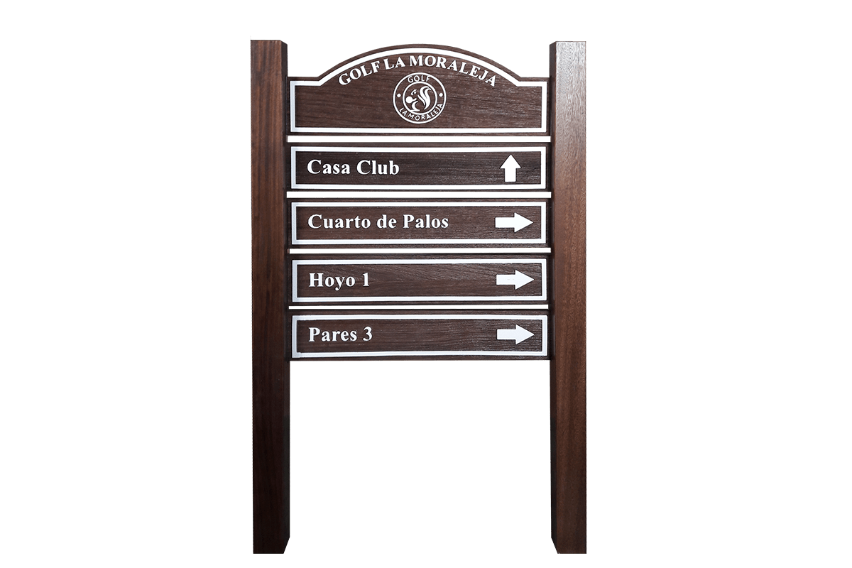 Señalización de madera de iroko grabada y lacada con tratamiento para exterior.
